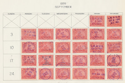 As I noted in a post about this calendar in April 2009, I originally obtained this calendar in an auction of Henry Tolman's collection by Robert Siegel. The calendar was sold in as a single lot near the end of Part 4 of the Siegel Tolman sales. As I wrote in that earlier post, it is not clear to me that this calendar was compiled by Mr. Tolman. Margin notes in Tolman's hand that spell out the identification of certain cancels read like the notes of someone who is reviewing a calendar after it has been completed by another and not the notes of someone that had spent 100s if not thousands of hours putting together such a calendar.