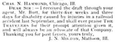 He was frequently acknowledged and thanked in the journal The Travelers Record for his services by policy holders after Travelers adjusters paid the claims on the policies he sold them: